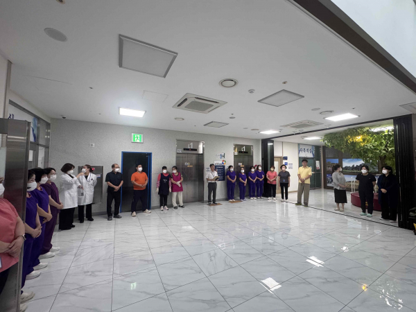 매월 첫째주 월요일 아침에 전 직원이 모여 친절교육과 더불어 최우수병동 시상, 칭창릴레이, 우수직원 포상 등을 합니다
